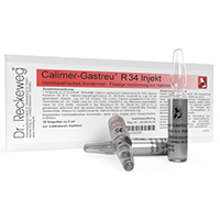 Calimer-Gastreu R 34 Injekt, Flüssige Verdünnung zur Injektion. Anwendungsgebiete: Registriertes homöopathisches Arzneimittel, daher ohne Angabe einer therapeutischen Indikation.