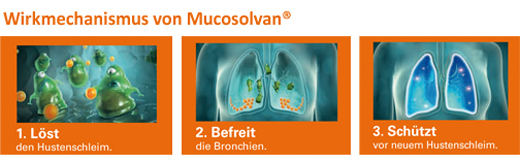 Das in Mucosolvan® enthaltene Ambroxol 1. löst den zähen Hustenschleim, 2. befreit die Bronchien und 3. schützt vor neuem Hustenschleim. So ermöglicht es Ihnen Mucosolvan®, wieder tief und frei durchzuatmen und schnell gesund zu werden.