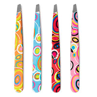 Kosmetik-Pinzette mit einer schrägen Spitze und buntem, graphischen-Design. Die Pinzette eignet sich durch die Griffigkeit der Spitze besonders für feine Zupfarbeiten und präzises Arbeiten. Sie ist handlich und angenehm in der Handhabung. Gefertigt aus Edelstahl und bunt lackiert.