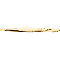 Eine Pinzette ist immer nur so gut, wie ihre Spitze. Die Beschaffung und die Form dieser definieren das Einsatzgebiet. Diese spezielle Pinzette eignet sich dank der abgewinkelten Spitze mit einer hohen Griffigkeit für feine und präzise Zupfarbeiten vorwiegend an den Augenbrauen. Durch das abgewinkelte Maul hat man Blick auf das zu greifende Härchen. Durch Ihre Form ist Sie dabei handlich und angenehm in der Handhabung. Dieses Modell ist mit 18 Karat vergoldet.