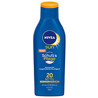 Die neue NIVEA SUN Schutz & Pflege Sonnenmilch LSF 20 mit Kleidungsschutz. Die innovative Formel hilft durch UV-Filter verursachte Flecken einfacher auszuwaschen – im Vergleich zu vorherigen Formeln. Schützt sicher vor UVA- und UVB-Strahlen, unterstützt die natürliche Schutzbarriere der Haut und spendet langanhaltende Feuchtigkeit: Schutz & Pflege Sonnenmilch.
