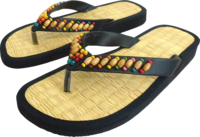 Das Fußbett und die Decksohle bestehen aus Riedgras. Zudem wurde in die Sohle Cassia-Zimt eingenäht, das Obermaterial ist aus Baumwolle gefertigt worden. Der Mittelsteg wurde bei diesem Zehentrenner etwas breiter gewählt. Die Laufsohle besteht aus Gummi.