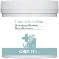 Die CBD Vital Vet Magen und Darmpflege sorgt für ein gutes Bauchgefühl. Besonders effektiv ist das Probiotikum für Vierbeiner durch die Kombination von Vitaminen mit Flohsamenschalen, Kräutern (Pfefferminze, Yucca, Traubenkernen) sowie durch Hanfmehl mit viel natürlichem CBD. Die Spezialformel enthält alles um die Verdauungsvorgänge zu regulieren. Die Präbiotika auf Ballaststoffbasis sorgen dafür, dass sich die ###guten### Keime im Darm gut vermehren und ansiedeln. Dadurch kann das physiologische Gleichgewicht der Darmflora rasch wiederhergestellt werden. Das Pulver zur Darmpflege hat Reinsubstanzqualität. Auf künstliche Zusatzstoffe, Konservierungsmittel, Lockstoffe, Getreide, Laktose und Fruktose wird konsequent verzichtet. Speziell für sensible Hunde und Katzen geeignet.