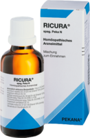 Ricura spag. Peka N, Mischung. Wirkstoffe: Capsicum annuum Dil. D4 [D4 mit Ethanol 15% (m/m)], Hydrargyrum sulfuratum rubrum Dil. D12 [ab D8 mit Ethanol 15% (m/m)] (= Cinnabaris), Kreosotum Dil. D6 [ab D4 mit Ethanol 15% (m/m)], Luffa operculata Dil. D6 [ab D4 mit Ethanol 15% (m/m)], Thuja occidentalis Dil. D6 [ab D4 mit Ethanol 15% (m/m)], Echinacea spag. Peka Dil. D12 (HAB, V. 47a), Plantago major spag. Peka Dil. D6 (HAB, V. 47a), Sanicula europaea Dil. D6 [ab D4 mit Ethanol 15% (m/m)]. Anwendungsgebiete: Registriertes homöopathisches Arzneimittel, daher ohne Angabe einer therapeutischen Indikation. Warnhinweis: Enthält 19 Vol.-% Alkohol!