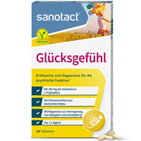 Die sanotact Glücksgefühl Tabletten mit B-Vitaminen und Magnesium für die Psyche und die mentale Leistungsfähigkeit. Niacin, Vitamin B12, B6 und Magnesium tragen zur normalen psychischen Funktion, zur normalen Funktion des Nervensystems und zur Verringerung von Müdigkeit und Ermüdung bei. Vegetarisch, lactosefrei, glutenfrei.