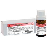 Thymus vulgaris D6, D12 sind registrierte homöopathische Arzneimittel, daher ohne Angabe einer therapeutischen Indikation. Hinweis: bei während der Anwendung des Arzneimittels fortdauernden Krankheitssymptomen ist medizinischer Rat einzuholen.