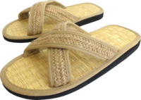 Das Fußbett und die Decksohle bestehen aus Riedgras, zudem wurde in die Sohle Cassia-Zimt eingenäht, das Obermaterial ist aus Baumwolle gefertigt worden. Der Mittelsteg wurde bei diesem Zehentrenner etwas breiter gewählt. Die Laufsohle besteht aus Gummi.